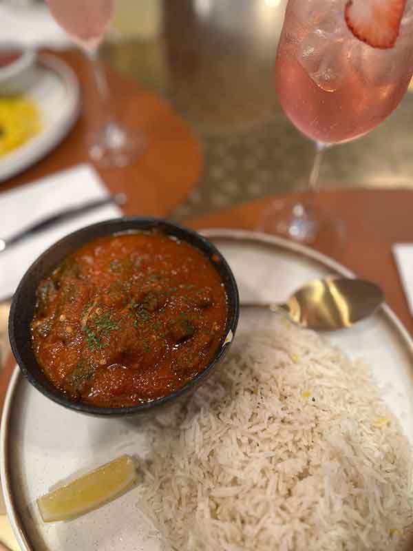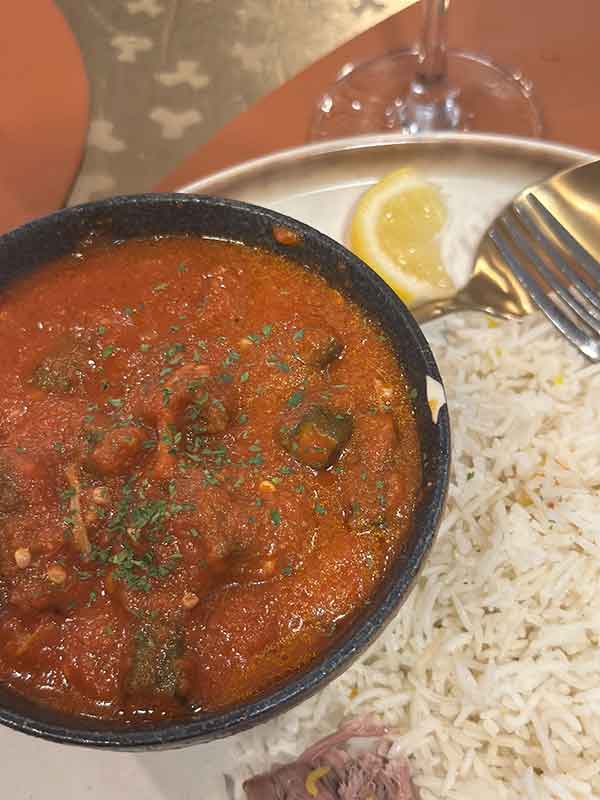 オクラとトマトを使った、爽やかな酸味が特徴のスープカレーのようなお料理で、バスマティライスと共に食べます。